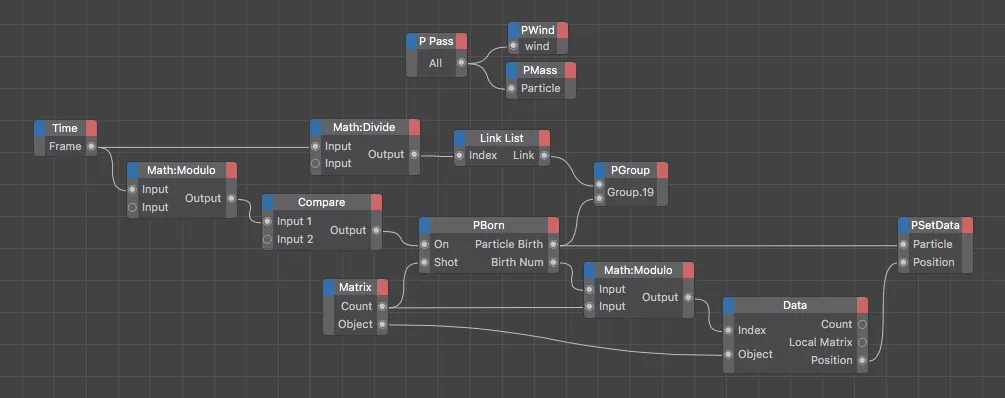 파티클 넘버링을 해결하기 위해 메트릭스로 복제 자리를 링의 형태로 만들고 shot 으로 생성된 파티클을 id(index) 순서에 맞게 링의 형태로 배치했다.