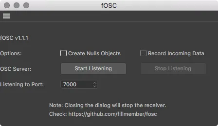 C4D 설치는 플러그인 폴더에 넣거나 CINEMA 4D 플러그인 설정에 등록하면 된다. 설치를 마치고 아래 그림과 같은 창이 열렸지만, 작동은 되지 않을 것이다. fOSC는 기본적으로 내부 메시지를 받도록 제작되어 외부 디바이스와 연결을 위해서는 수정이 필요하다.