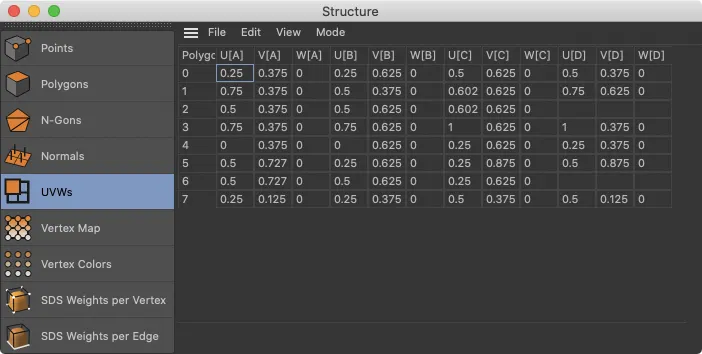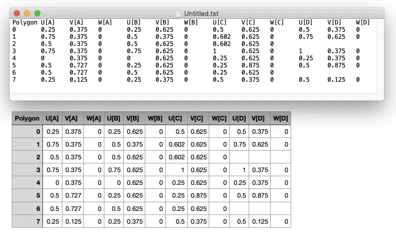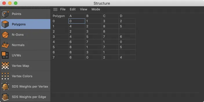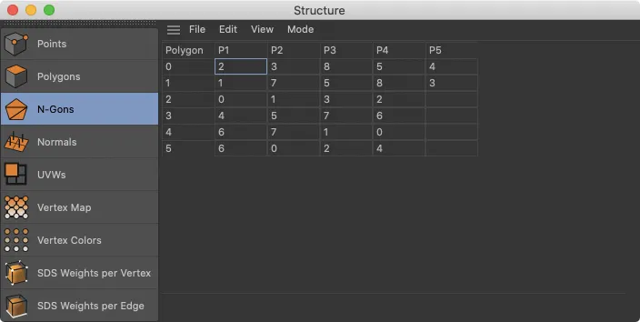 8줄의 정보가 있는데 N-Gon 보려고 추가한 8번 포인트로 인해 5각형이 2면이 생기고 3각,4각폴리곤으로 나누고있어 보이는 면은 6개, 구조적으로는 8개의 정보를 보여준다. (0+1, 2+3)