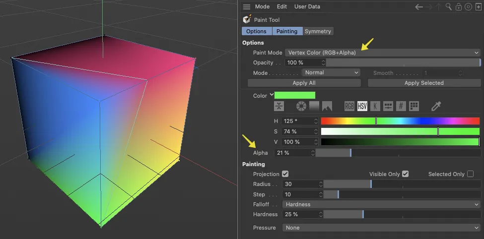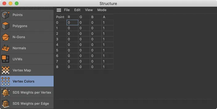각 포인트의 R, G, B, Alpha 수치를 보여준다.