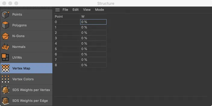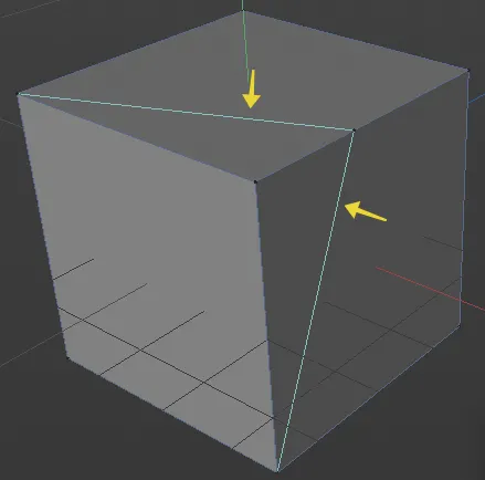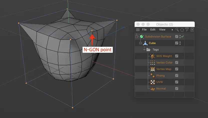 간단히 큐브 오브젝트를 에디터블하고 mode 메뉴에 있는 것중 빠진 normal, sds weight, vertex map, vertex color 태그를 추가했다. N-Gon 을 보기위해 포인트를 하나 추가해 두었다.