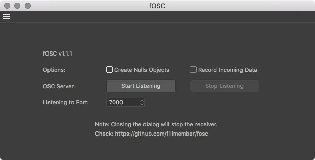 C4D 설치는 플러그인 폴더에 넣거나 CINEMA 4D 플러그인 설정에 등록하면 된다. 설치를 마치고 아래 그림과 같은 창이 열렸지만, 작동은 되지 않을 것이다. fOSC는 기본적으로 내부 메시지를 받도록 제작되어 외부 디바이스와 연결을 위해서는 수정이 필요하다.