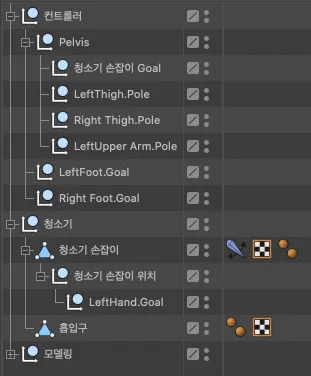 '청소기 손잡이 위치' 아래 왼손 컨트롤러를 child 한다. 또는 구속한다.