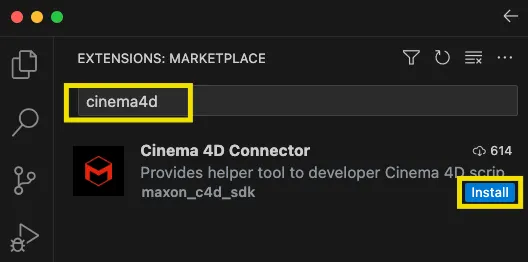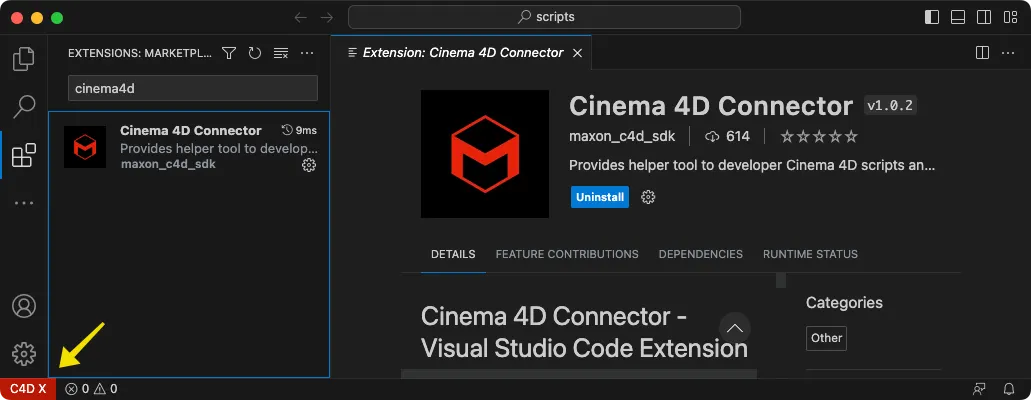 설치를 마치면 왼쪽 하단에 C4D X 라는 표시가 보인다. 없다면 VS Code 를 재실행한다.