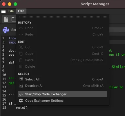 Script Manager > Edit > Start/Stop Code Exchanger 를 클릭한다.