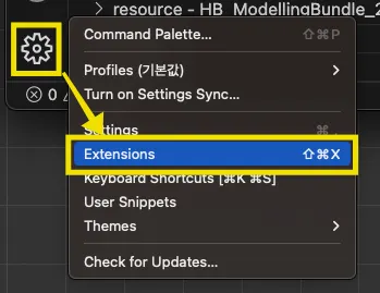 Visual Studio Code 의 관리 아이콘 > Extensions(확장)을 선택한다.