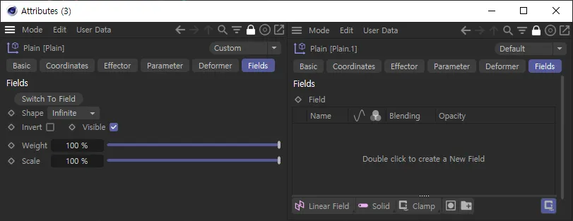 현재 두 이펙터는 동일한 ID 값을 갖고있는것으로보아 하나의 오브젝트에 예전 방식을 갖고있도록 디자인 된것으로 보이고 실재로 Field 로 전환할 수 있는 버튼을 제공합니다. 이 버튼을 누르면 weight 옵션들이 없어집니다.