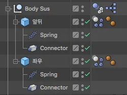 서스펜션은 Slider connector와 Spring dynamic을 사용했다. 앞뒤 , 좌우로 나누고 Range Mapper 노드로 기우는 정도를 조절했다. 아래는 3배정도 강하게 조절된 모습이다.