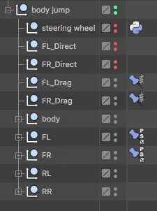 바퀴에만 회전 방향에 반응할수있도록 적용하였다. 바퀴와 마찬가지로 추가적인 null 이 바디의 전 위치(매트릭스)를 기준으로 변화량을 체크하고 그에 따라 Range Mapper 와 같은 방식으로 FL_Direct의 회전 값으로 전달되고 있다.