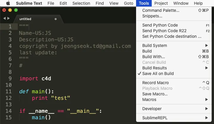이 플러그인은 Sublime Text 에서 작성중인 스크립트를 C4D로 바로 실행할 수 있다.
